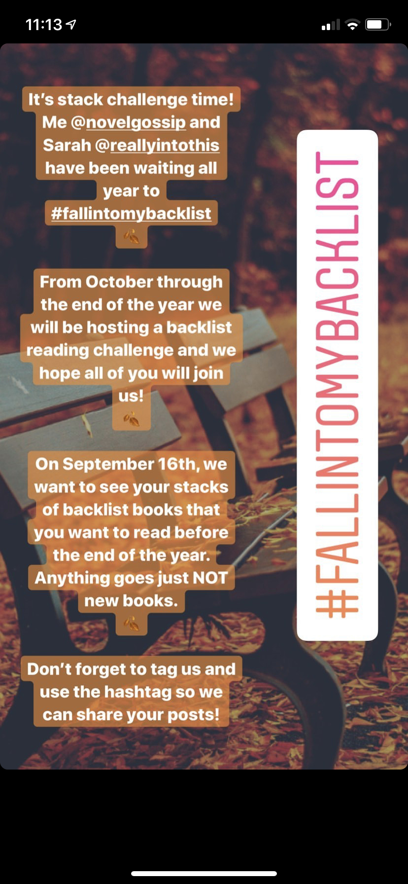 Hey guys, I hope everyone is having a good weekend! I wanted to check in and tell you all about something fun I have planned with my friend Sarah at ReallyIntoThis We’re hosting a backlist reading challenge over on Instagram and we wanted to make sure we invited y’all to join in too. Tomorrow we’re having a stack challenge where we want to see a pile of older books that you would like to read before the end of the year. Then, from October through December we will be focusing mainly on backlist books. We would love to have anyone who wants to join us by using #fallintomybacklist anytime you post about an older book! We have some exciting stuff planned and both of us are really looking forward to reading some books we’ve had on our shelves for far too long. You can find us both on Instagram me and Sarah.