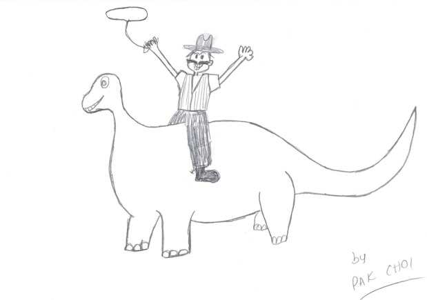 However, I was distracted by the sight of the infamous Silverbell Road Crosses that the museum also has on display. The crudely cast lead crosses are perhaps evidence of a mythical colony of religious exiles who fled from Rome over twelve hundred years ago and settled in Arizona centuries before the arrival of the Spanish conquistadors. The badly-formed Latin inscriptions and the carved imagery (including a dinosaur, no less!) offer hints of a marvellous story of great adventure, remarkable encounters in the Arizona desert and possibly even dinosaurs. Or, they all form part of an elaborate hoax, created for unknown reasons by a local Mexican sculptor. If only I had the time to study them further and draw my own conclusions! Pak Choi’s own conclusions are evidenced in this delightful drawing he has rendered.
